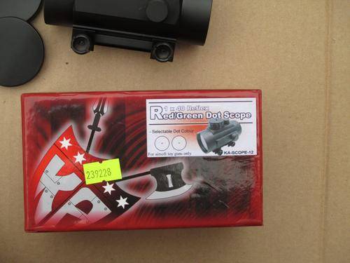 King Arms 1 x 40 Red/Green Dot Scope for 20mm rails, has a selectable green/red dot brightness from 0-5. Powered by one Cr2032 battery (included), and includes the plastic protective covers.