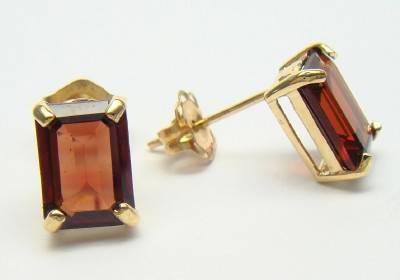 DESCRIPTION: EMERALD CUT GARNET & GOLD STUD EARRINGS