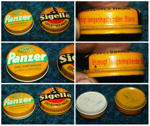 -2 1950's emty tins Germany Panzer edel hartwachs and Sigella edel Bonner wachs CONDITION: SOLD as FOUND - -Please see ALL IMAGES below |