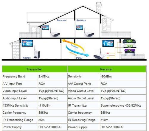 The product consists of a transmitter and a receiver. It adopts an advanced 2.4GHz wireless transmission scheme and has the advantages of a long transmission range, strong anti-interference and high mobility. It can transmit AV signals of DVD, DVR, CCD camera, IPTV, satellite STB, digital TV STB and other similar devices, by means of radio waves and receive them at distant end and input them to a TV set to be displayed. It enables you to easily realize wireless sharing of HD AV data and enjoy untrammeled hi-fi audio and visual effects.