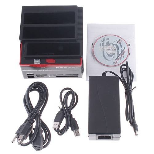 3 slots triple docking (2 x SATA slot and 1 x IDE slot). Clone function. 2 ports USB 2.0 Hub. MS/M2/XD/CF/SD/TF card reader. Helpful hints: 1. you can use it immediately and needn't install the disk 2. This item is NOT compatible with?all WD hard drives. Features: Compliant with serial ata & pata international organization: serial ata version 2.6. Supports SATAI/II (1.5G/3.0G) high speed. Supports 2x 2.5" & 3.5" SATA & 1x IDE hard drives simultaneously without any adapters. Offline Hardware Cloning function. Software backup function. Supports One Touch Backup (OTB) function. Supports one-button disk copy (clone function). Supports USB 2.0 hi-speed (480Mbps) and full-speed (12Mbps) operation. Hot swappable for most operation systems (Win 98/ME/2000/XP/Vista/Win 7, Mac OS 9.X/10.X, Linux). Plug and Play. 12V 5A external power supply. 2 ports USB 2.0 Hub. MS/M2/XD/CF/SD/TF card reader. Specifications: HDD supported: 2.5"/3.5" SATA, STAT II, IDE HDD HDD capacity: Up to 2TB Interface: 1 x XD, 1 x MS, 1 x SD, 1 x CF, 1 x M2, 1 x TF, 1 x USB 2.0, 2 x USB Hub Power supply input: 100~240V, 50~60hz Power supply output: 12V, 5A Plug standard: Type B (as shown in the pictures) OS supported: Win 98/ME/2000/XP/Vista/Win 7, Mac OS 9.X/10.X, Linux Color: Black and Red Product dimensions: 137x134x66mm Product weight: 302g Package dimensions: 160x151x120mm Package weight: 819g |