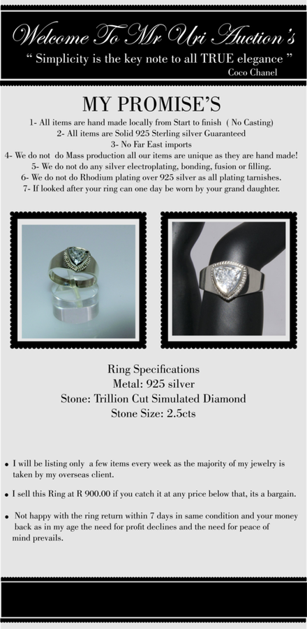 2.5 Carat Trillion Cut, Cr Diamond, Solid 925 Silver, Ring Size 7