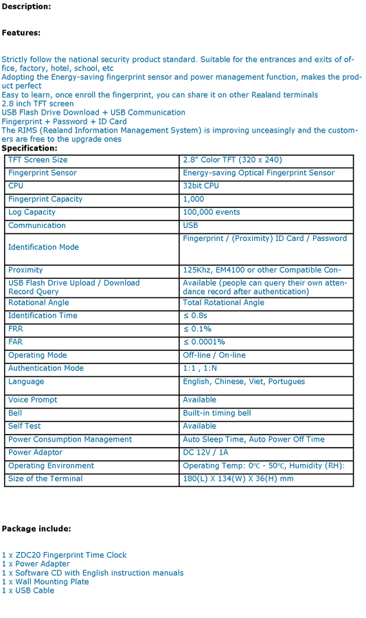 2.8" Biometric Attendance Fingerprint Time Clock/Password PIN/ID Card Reader USB