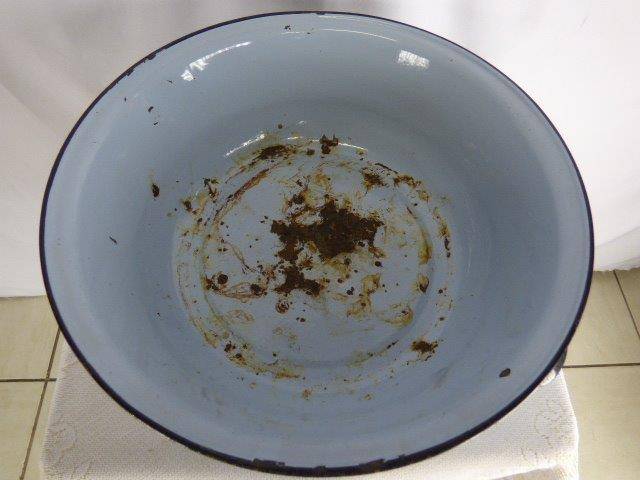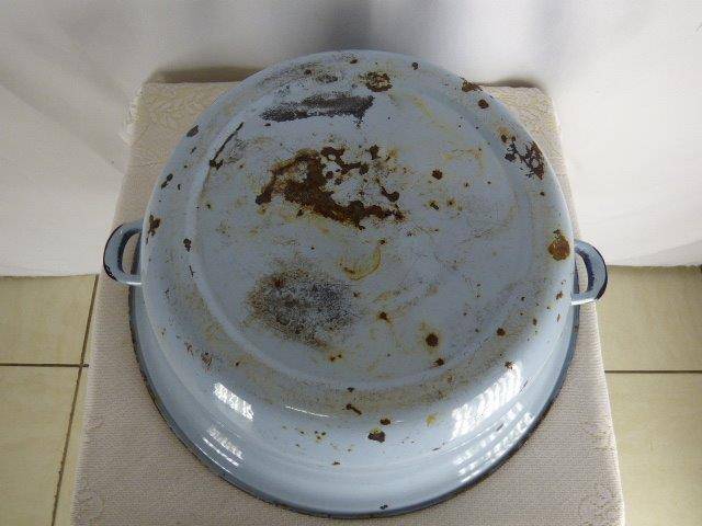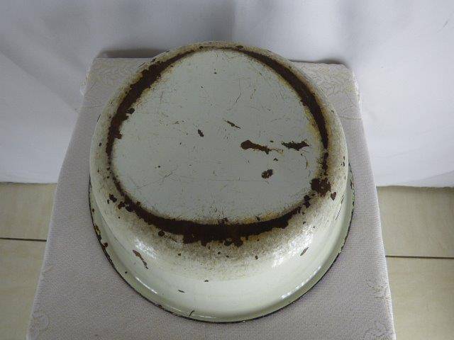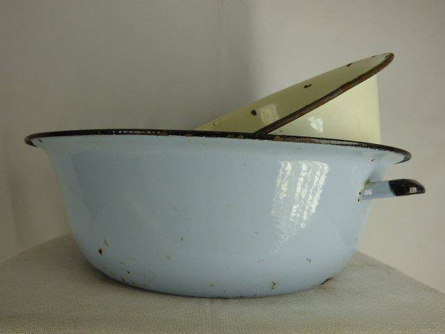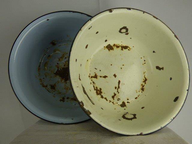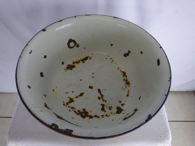 THESE TWO FANTASTIC LARGE ROUND WHITE AND BLUE ENAMELWARE BASINS HAVE LOADS OF CHARACTER AND CHARM. THEY MEASURE 45cm AND 50cm ACROSS AND 15cm AND 15.5cm HIGH. THESE BASINS HAVE AGE AND USAGE RELATED WEAR AND TEAR, BUT IT'S WHAT GIVES THESE AMAZING OLD ENAMELWARE PIECES THEIR CHARACTER AND CHARM. THEY MAKE BEAUTIFUL POTTED PLANT HOLDERS AND HAVE MANY OTHER USES. PLEASE VIEW THE PICS CAREFULLY FOR THE GENERAL CONDITION.