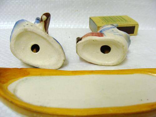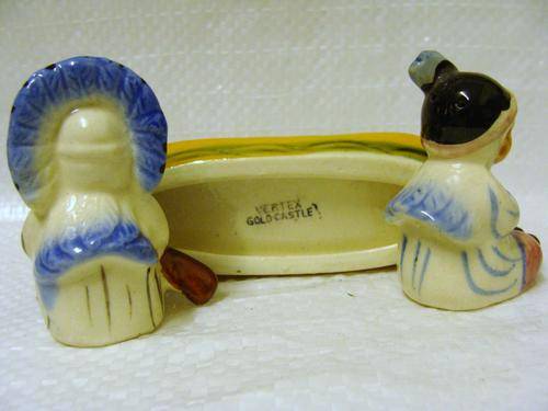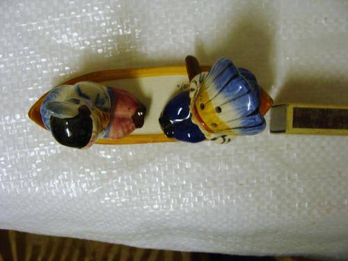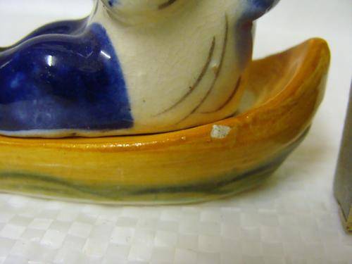 SOLD AS IS IN PICTURE CONDITION - NORMAL AGE AND USE AGE RELATED WARE AND TEAR- crazing to glaze a small chip to top edge of canoe -NO BOTTOM CORKS -SEE PICTURES