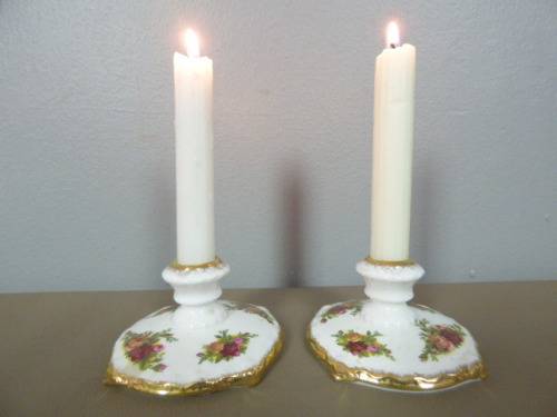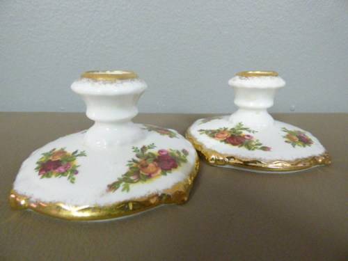 THESE BEAUTIFUL, VERY ELEGANT AND DAINTY CANDLE HOLDERS ARE PART OF THE ROYAL ALBERT MONTROSE SHAPE SET. THEY ARE EXQUISITE WITH A GLITTERING GOLD BORDER. PURE ELEGANCE ON YOUR DRESSER OR TABLE TABLE. PATTERNED IN THE *OLD COUNTRY ROSES* THEY ARE EXQUISITE! STUNNING ON SHOW. THE ONE HOLDER HAS A SLIGHT CRACK ON THE BOTTOM.