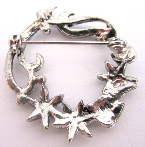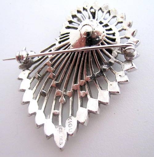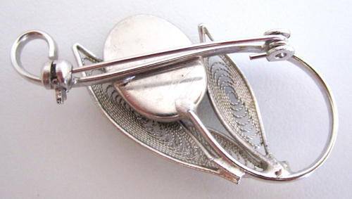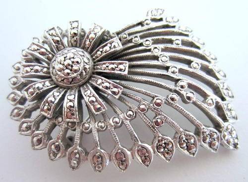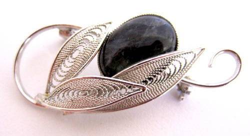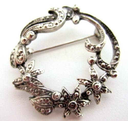 2 Marcasite brooches--No marcasites missing. They are both plated. The other brooch is filligree with a dark green stone that may be labdorite but I am not sure.