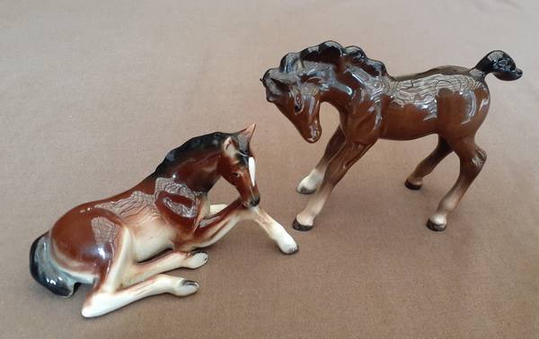 Two beautiful bay ceramic Horse foals One standing approx 8 cms tall (beswick) the other with a white blaze lying down. 8 cms nose to tail. No chips or cracks noted. These are used vintage ornaments. Pargo shipping R60.00 to a destination of your choice. Other options available under shipping.