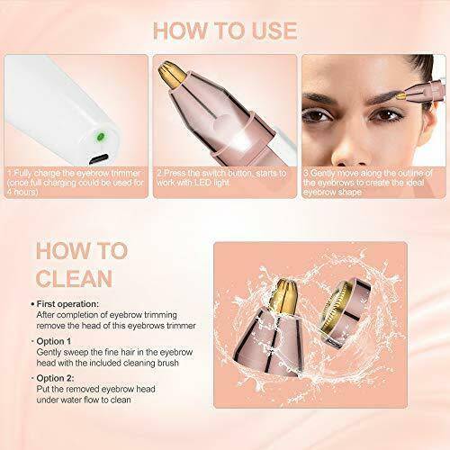 Rechargeable & Easy to CleanThe eyebrow razor is USB rechargeable and can be connected to mobile power supplies and adapters. It is environmentally friendly and economical. After being fully charged, it can work uninterrupted for about 45 minutes. After use, you can clean the trimmer head with water or included brush.