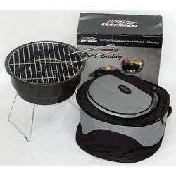 The lower half of the carrying bag contains the grill. The grill can be fueled by either wood or charcoal. It has two grates, an air vent, removable legs and a grate lifter. Enamel coating makes it tough and long lasting. A perfect tailgating or camping grill!