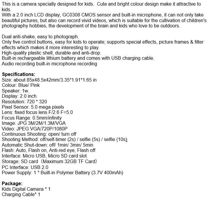 2" Kids Digital Camera Take photos, Record Videos, Build in Microphone, Rechargeable etc