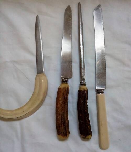 2 knifes, a sharpener and a letter opener, horn and warthog tusk