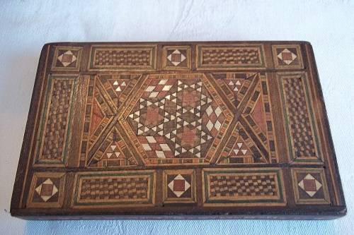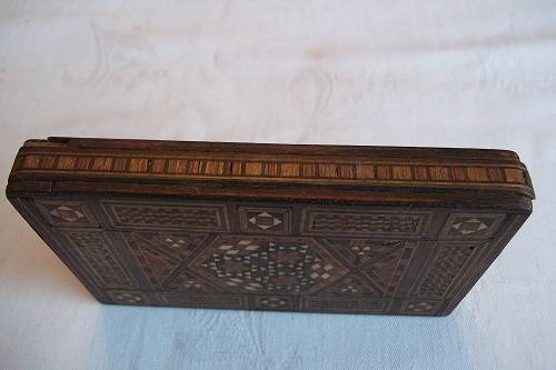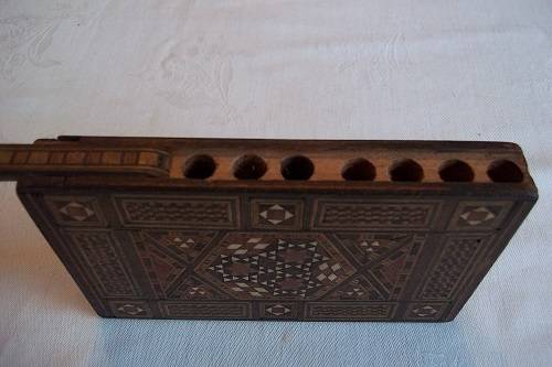 A lovely hand made marquetry cigarette dispenser. I think that this box may be Turkish in origin, dating back to the 1950/60s. It has very fine marquetry detail - must have taken hours to make. It is made to hold 10 cigarettes, with a sliding top opening the dispenser. It measures 12.5cm x 8cm. It is in good condition for its age.