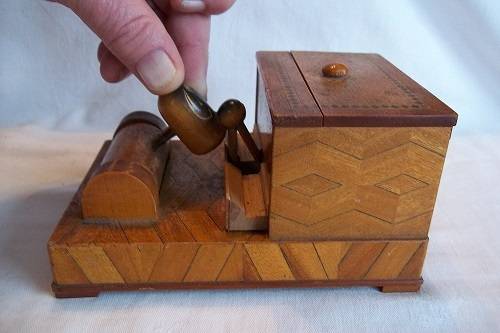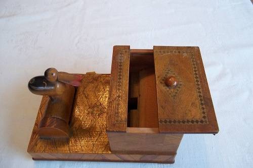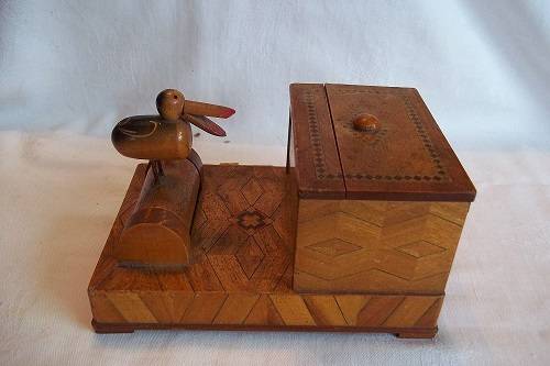 A vintage Japanese marquetry/ veneer duck cigarette dispenser. I would estimate that this dispenser dates back to the 1950s. It operates by moving the lever next to the duck, after which the drawer opens opposite the bird, and the bird goes down to pick up a cigarette in its beak.The sides appear to be veneer, while the top seems to be marquetry. It measures 15cm x 9.5cm. It is in working condition - bit of veneer loss.