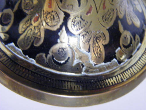 Notice there are spots where the enamel decor has come off, still not glaringly noticeable but mentioned for accuracy sake. sake. Notice one has a small dent as detailed in the last photo below.
