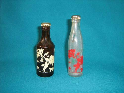 2 OLD COW BOY MINIATURE GLASS BEER BOTTLES.