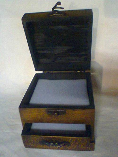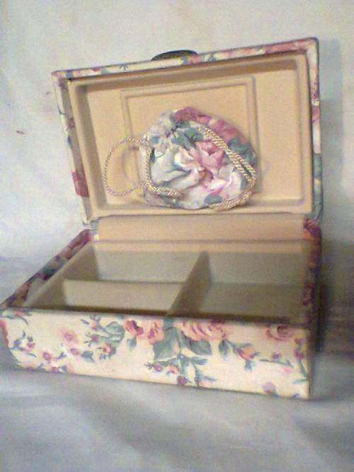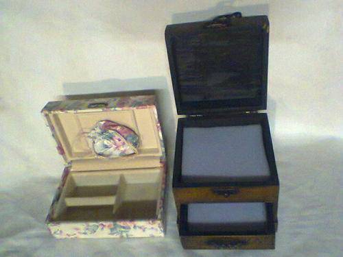 Both are in good condition. Rose patten Jewelry Box Size: 150mm Long x 95mm Wide x 65mm Tall closed. The wooden Trinket Box is : 130mm Long x 115mm Wide x 125mm Tall.