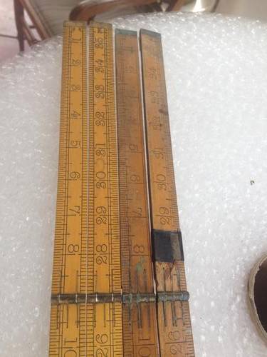 A nice pair of old wooden and brass rulers, one by Rabone and the other by Sybren. They are both in feet and inches. The Sybren has had a old break and then been repaired.