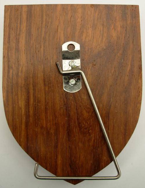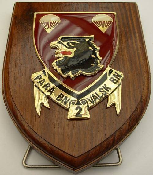 2 Parachute Battalion shield badge with stand. The decoration is made in the same manner as the shoulder flashes. (2 Valskerm Bataljon). Bilingual Eng/Afr abbreviations.