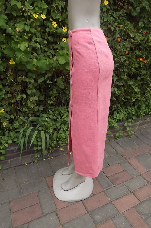 Two Piece Apricot Colour Skirt Suit in size 10/34 - made by Boutique - polyester with linen look - button down jacket and skirt - large covered buttons - good condition