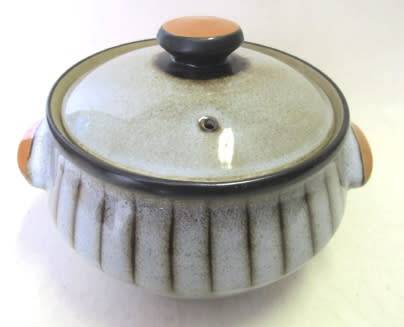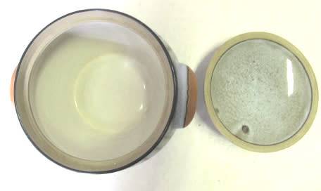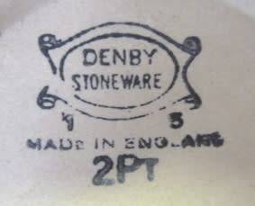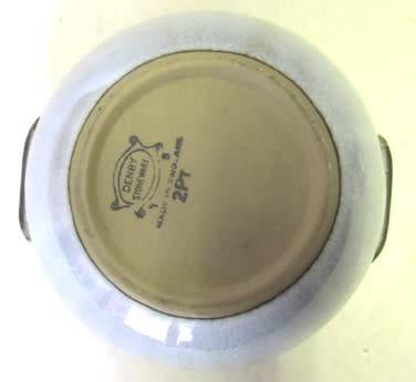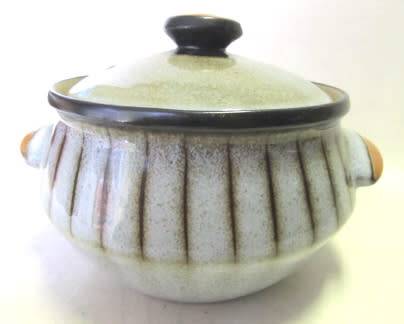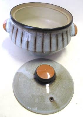 A 2-pint stoneware lidded tureen, made by the Denby Pottery Company in Derbyshire. For a detailed history of the company, see https://en.wikipedia.org/wiki/Denby_Pottery_Company. Condition: used but still good, with no cracks or chips. Height (including lid) 138 mm; rim diameter 148 mm.