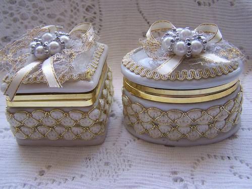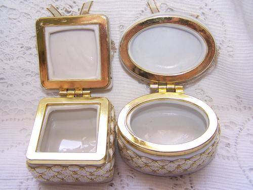 A PAIR OF BEAUTIFUL PORCELAIN BOXES, DECORATED WITH LACE AND BEADS.