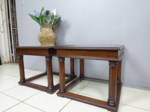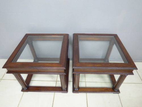 2 SUPERB, STYLISH MAHOGANY GLASS TOP TABLES. THESE FANTASTIC TABLES CAN BE USED NEXT TO A CHAIR, SOFA FOR DRINKS IN A FORMAL LOUNGE ON THE PATIO OR IN THE LAPA. THEY ARE VERY VERSATILE TABLES AND HAVE ENDLESS USES. THESE TABLES MEASURES APPROXIMATELY 60cm x 60cm x 53cm HIGH. THESE TABLES ARE IN FABULOUS CONDITION!! THEY ARE SOLID AND STURDY TABLES AND STAND FIRMLY ON THE GROUND.