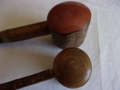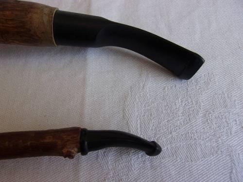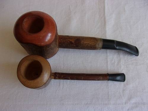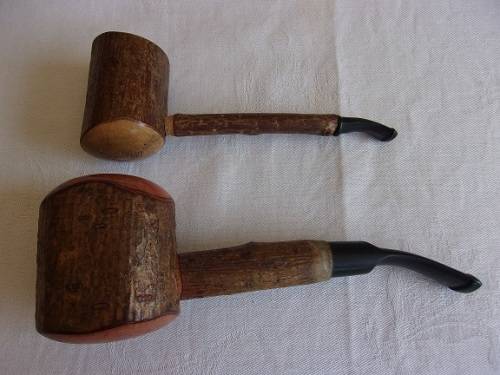 2 Vintage stamped Cherrywood smoking pipes for 1 bid - unused. I would date these 2 pipes to the 1960s. They are marked "Cherrywood, Foreign Made" underneath. They are made from the crosscut of a Cherrywood branch (with bark) with a hollowed straight stick as the stem and a plastic tip. They measure 16cm and 13cm respectively. The pipes are in good unused condition. Great buy for the collector.