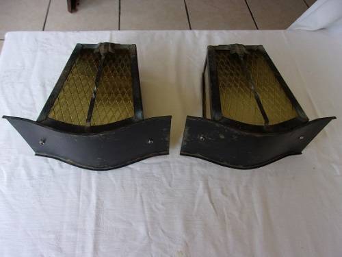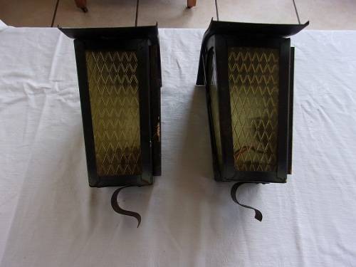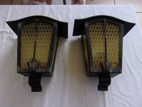 2 Vintage wall mounted wrought iron and glass wall mounted porch lights. I would estimate that these 2 old lights date to the 1960/70s. They are made from wrought iron, and have 3 yellow glass sides. Thesy are wall mounting lights, and measure 31cm x 21cm x 12cm. They are in good condition for their age - glass is all intact. Great display piece for outside.