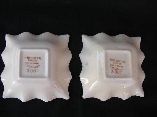 These two floral Trinket bowls, have the same sort of pattern, but are both unique, unfortunately they both have crazing, more serious the underside, they measure approximately 8cm's across, and 2cm's high.They are both being sold as one lot. Please see pics for more details, on the second last pic you will see a manufacture defect, the ceramic seems raised: