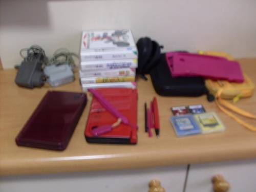 2 X NINTENDO DS CONSOLES 4 STYLUS PENS 1 GAME POUCH 2 CHARGERS 9 GAMES 3 POUCHES