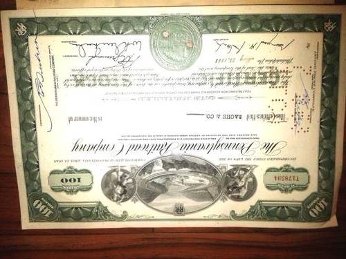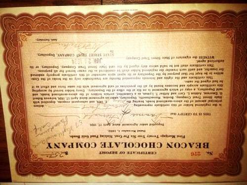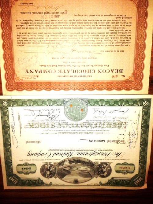 2 X share certificates Beacon Chocolate CO 1924 and The Pennsylvania Rail Road Co 1963