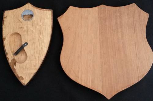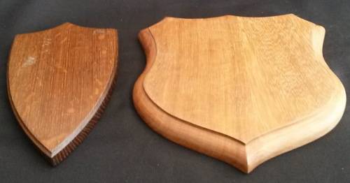 Very nice 2 x wooden shields. Unused. Smaller one measures about 20,7cm x 12,1cm x 1,6cm thick. The bigger one measures 22,8cm x 22,4cm x 2,2cm thick. Ideal for your man cave emblems etc.
