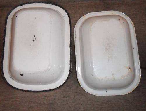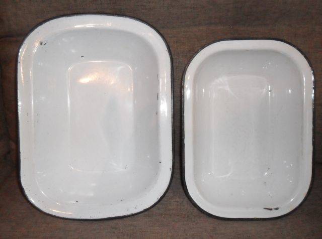 2 X WHITE AND BLACK ENAMEL PIE DISHES - MEASURES 28CM X 20.5CM X 6CM -----25.5CM X 18CM X 6CM DEEP--PLEASE VIEW PHOTOGRAPHS FOR CONDITION  -