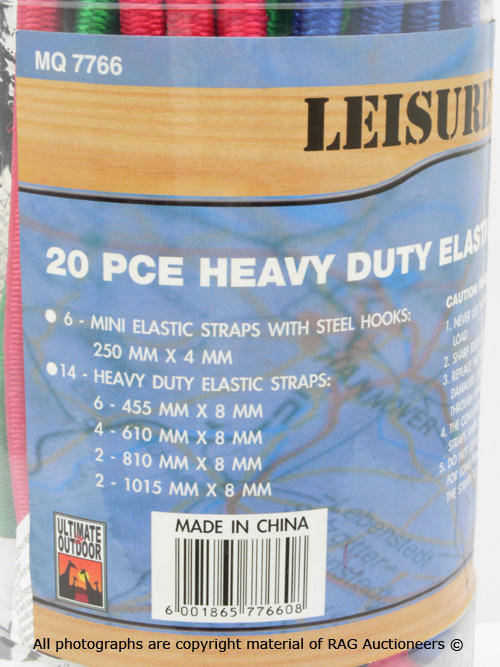 Includes: 6 mini elastic straps with steel hooks: 6 X (250mm X 4 mm) 14 heavy duty elastic straps: 6 X (455mm X 8 mm) 4 X (610mm X 8mm) 2 X (810mm X 8mm) 2 X (1015mm X 8mm) |