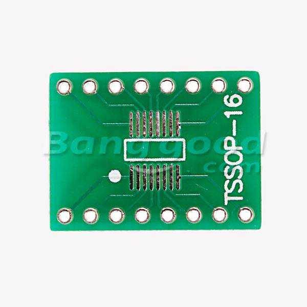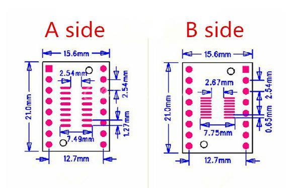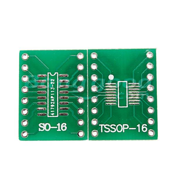 This is a Double-Side PCB Circuit Board, each PCB board has 16 pins. A side for pin pitch size 1.27mm, it can be used for most of the SO16/SOP16/SOIC16 to 2.54mm DIP. B side for pin pitch size 0.65mm, it can be used for most of the SSOP16/TSSOP16/MSOP16 to 2.54mm DIP. The PCB board mounting 2.54mm pitch Pin Header,it can be plugged directly into 2.54mm pitch PCB board,breadboard and 600mil width 16 pin DIP socket.