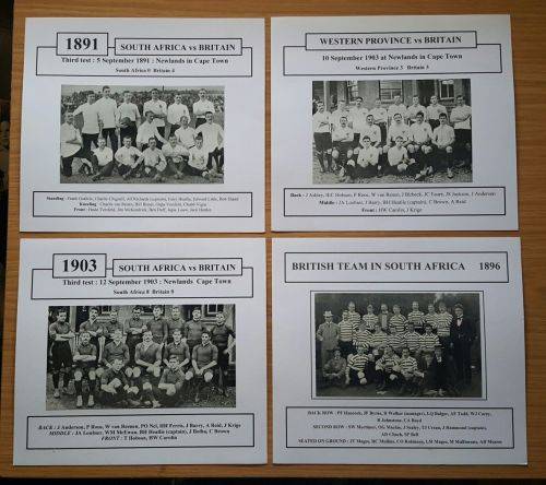 Below : Pictures of the following rugby teams, each glued to a 240gsm board measuring 235mm x 210mm. The heading and names of the players are printed on the board : SA vs Britain - 3rd test 1891, Western Province vs Britain 1903, SA vs Britain - 3rd test 1903, British team in South Africa 1896.