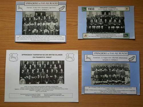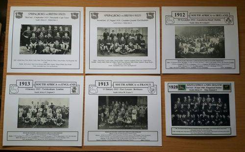 Below : Pictures of the following rugby teams, each glued to a 240gsm board measuring 235mm x 210mm. The heading and names of the players are printed on the board : Springboks vs British Isles - 3rd test 1910, Springboks vs British Isles - 2nd test 1910, SA vs Ireland 1912, SA vs England 1913, SA vs France 1913, SA vs New Zealand - 1st test 1928 (slightly smaller).