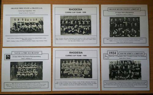 Below : Pictures of the following rugby teams, each glued to a 240gsm board measuring 235mm x 210mm. The heading and names of the players are printed on the board : Orange Free State vs Transvaal - Currie Cup 1931, Rhodesia Currie Cup team 1896, Orange River Colony vs Britain 1903, Natal vs the All Blacks 1928, Rhodesia Currie Cup team 1906, South Africa vs Britain - 3rd test 1924.