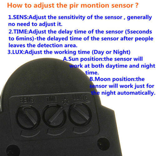 TIME button: Adjust the sensor's delay time(3sec-7min).Delay time refers to the time from the sensor begining to sensor to people leaving.