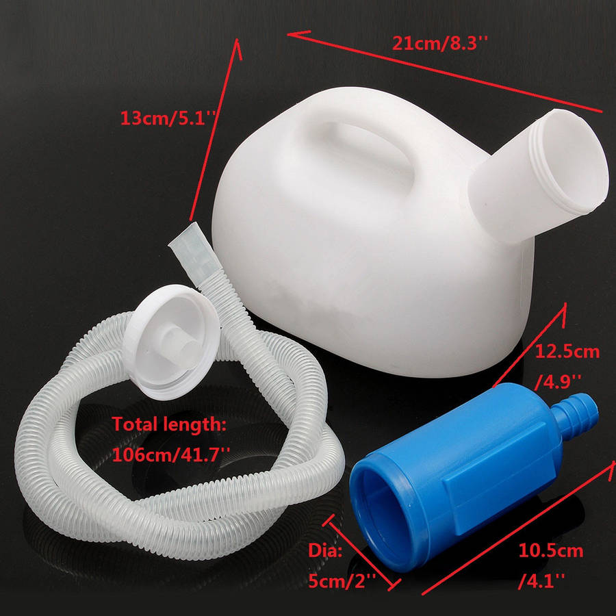 Package weight: 0.20 kg Features: 1. The unique design of this urinal bottle makes it completely spill proof and leak proof. 2. Can even be left in the bed, making it instantly available to the user. 3. Suitable for male who have self-care ability. 4. Entire item is washable. 5. Easy to empty and clean using household disinfectants. 6. The capacity is 2000ml. Description: Material: Plastic Size: Pot: 21 x 12.5 x 13cm/8.3'' x 4.9'' x 5.1''(L x W x H) Urine Bucket: 10.5 x 5cm/4.1'' x 2''(L x D) Tube: 106cm/41.7''(Length) Color: White+Blue Package Included: 1pc X Male Urine Bottle 1pc X Urine Bucket 1pc X Tube Notice: 1.Please allow 1-3cm error due to manual measurement.Pls make sure you do not mind before you bid. 2.The color may have different as the difference display,pls understand.