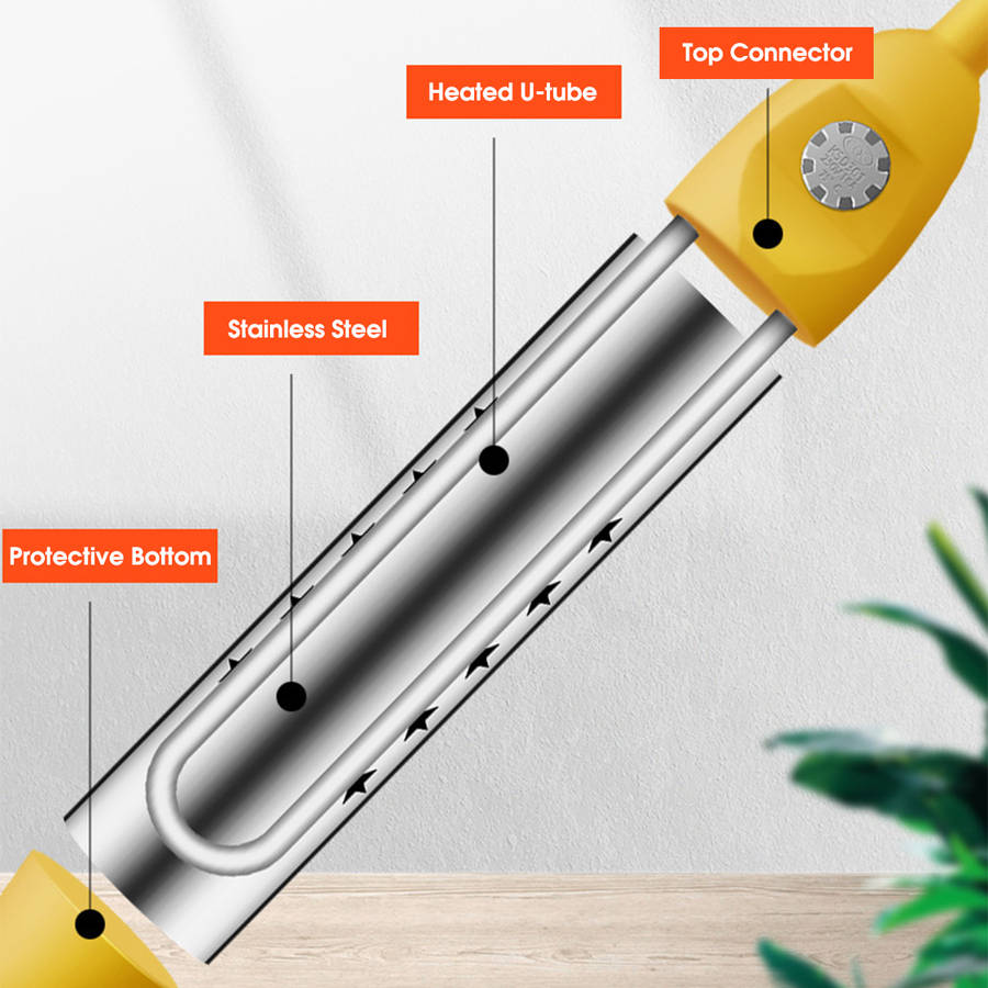 Warning: -Place the container in a safe, stable place and place the product. Inject water, the water surface must be immersed in the electric heating tube thermostat.