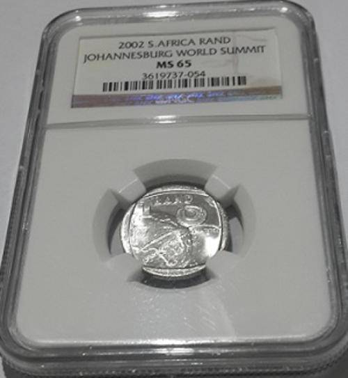 2002 JOHANNESBURG WORLD SUMMIT R1 COIN , SLABBED , NGC GRADED MS65 (only 104 in this grade at NGC) ....VERY SELDOM SEEN !!!! GRAB THIS LIMITED EDITION PIECE FOR YOUR COLLECTION.....