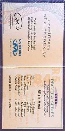 2006 GOLD 1/10oz PROOF - PROTEA " BISHOP TUTU " - 24KT