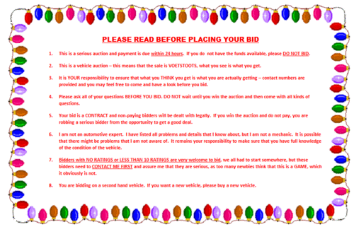 ASK ALL QUESTIONS BEFORE YOU PLACE YOUR BID, NOT AFTER YOU WIN. CONTACT DETAILS ARE PERMITTED, PLEASE FEEL FREE TO CONTACT THE TEL NO BELOW, TO ASK QUESTIONS OR TO ARRANGE FOR VIEWING
