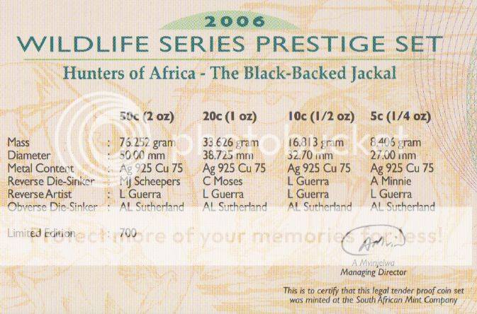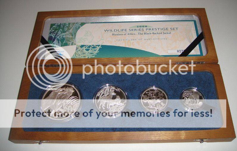 The Wildlife silver 4-coin collection was first introduced in the year 2000 and features African animals. The 2006 set depicts the Black-Backed Jackal. This set is number 220 out of a limited edition of only 700 sets issued by the South African Mint.