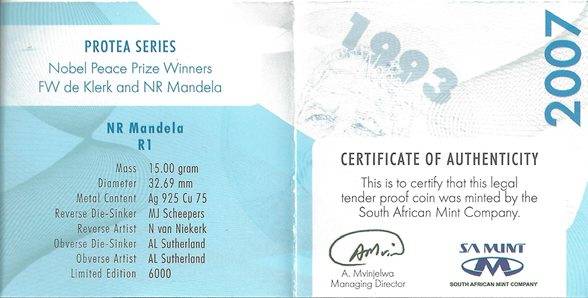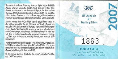 2007 Protea Mandela R1 Sterling Silver Proof Coin 1 Oz as issued by SA Mint