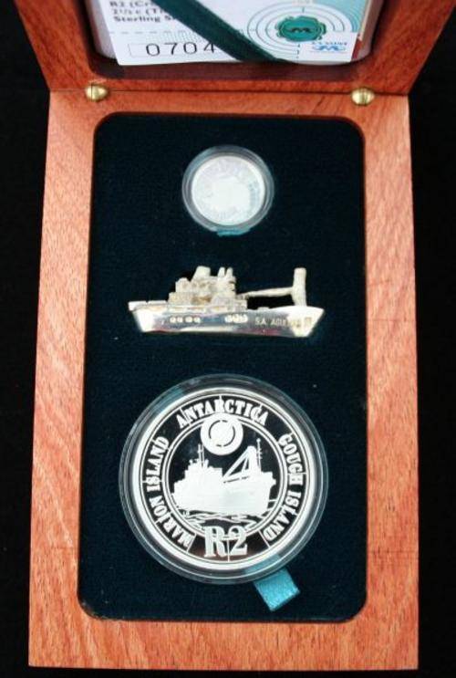 | The miniature model of the SA Agulhas, the Antarctic supply and oceanographic research vessel of South Africa, was created in sterling silver and weighs 20 grams. |