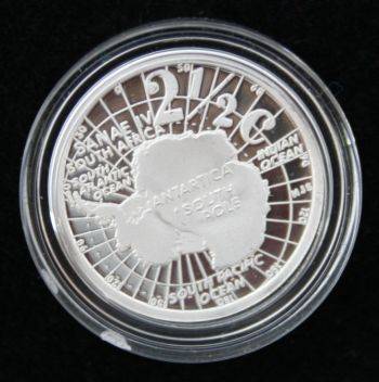 2 1/2c (Tickey) Metal Content: Ag 925 Cu 75 (Sterling Silver) Diameter: 16.3 mm The map of Antarctica is featured on the reverse of the tickey. Indicated on the map is the position of SANAE IV, built on a rocky outcrop about 170km from the coast. |