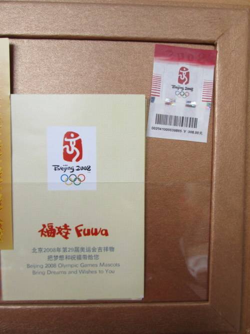 Size of box 28.5 cm x 18 cm x 4 cm. Weight +/- 750 grams. The explanation reads, "Each of the five Fuwas, the mascots of the 2008 Beijing Olympiad, symbolizes a nice blessing and will bring dreams and wishes to you."
